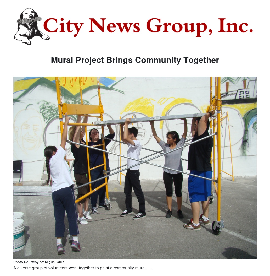 The center, which will open March 28th, connected with Elizabeth Jasso Flores, a California State University San Bernardino graduate, and asked her to design a mural for the south wall of the building. The mural features a multicultural scene and San Bernardino city landmarks such as the Arrowhead Mountains. Resident volunteers began painting at 8 a.m.
