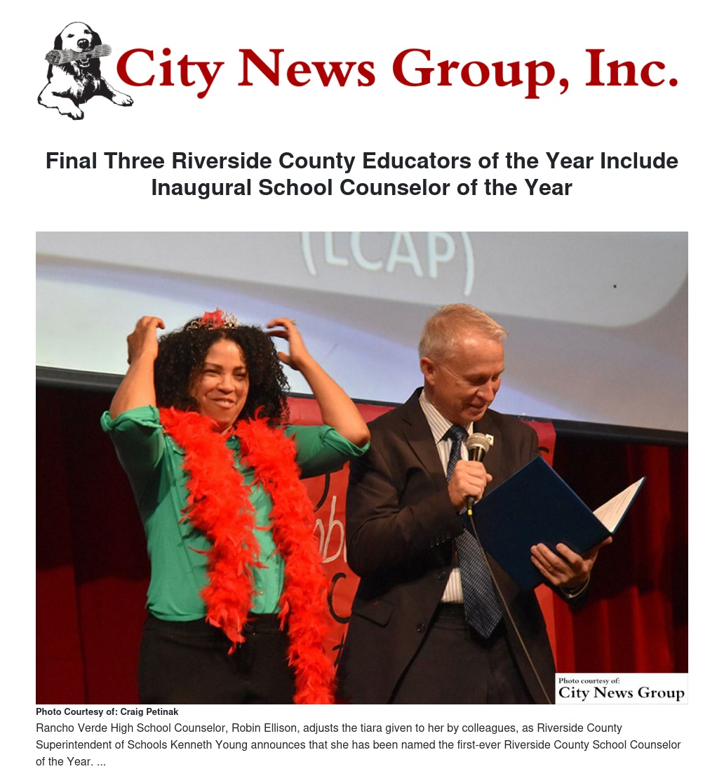 In the main lobby of Rancho Verde High School (Val Verde Unified School District), the first-ever Riverside County School Counselor of the Year award was presented to Robin Ellison. Ms. Ellison, a resident of Riverside, has served as a counselor at Rancho Verde High School for eight years. During her tenure as head counselor, Free Application for Federal Student Aid (FAFSA) applications went up by 25% in one year and A-G completion rates reached 99%. Her principal, Ross Godfrey, shared that “one of the greatest assets that Robin brings to our guidance department is her passion to always learn new things and keep up to date with current trends.”