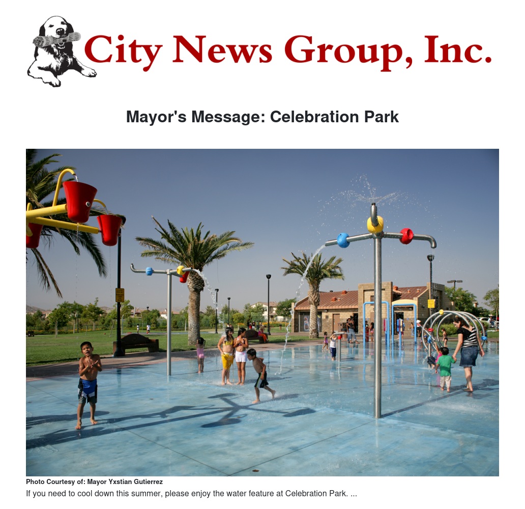 If you need to cool down this summer, please enjoy the water feature at Celebration Park. The Celebration Park water feature operates from 10:00 a.m. to 6:00 p.m. daily.