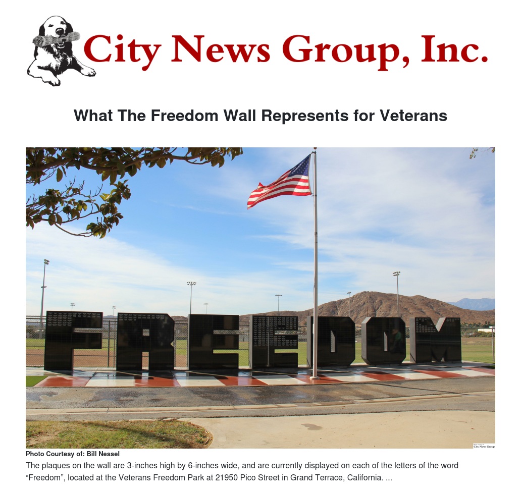 GRAND TERRACE>> On Nov. 11, 2016, there will be many family members and both present and former veterans honoring their comrade in arms at the dedication of the Veterans Wall of Freedom in Grand Terrace, California.