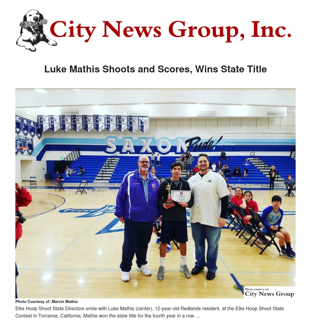 REDLANDS>> Luke Mathis, 12–year-old Redlands resident, competed in Elks Hoop Shoot Saturday, Feb. 4 in Torrance, California where he won the state title for the fourth year in a row.