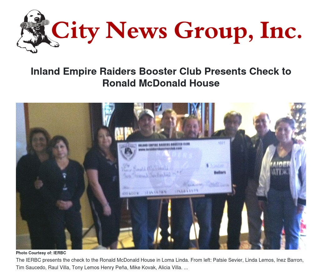 The Inland Empire Raiders Booster Club (IERBC) was proud to present a $3,200 check to Mike Kovak, director of the Ronald McDonald House of Loma Linda. This is their largest donation to date and it would not have been possible without the outstanding support the club gets from all the Raider fans that show up every week and participate in their raffles and the entire Upper Deck Sports Lounge management and staff.