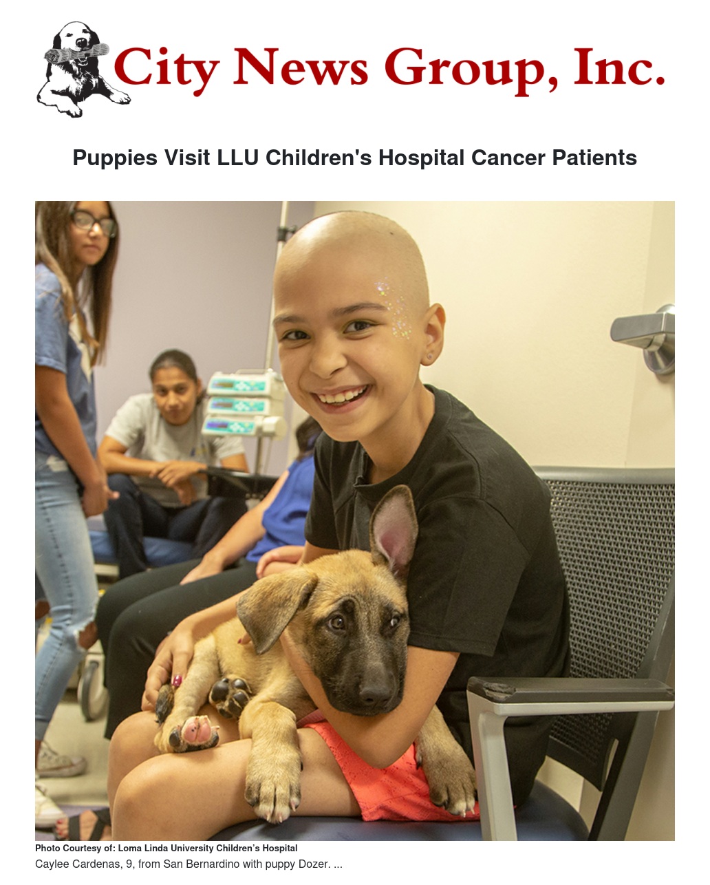 Yucaipa Animal Placement Society (YAPS) collaborated with restaurant chain Raising Cane's in bringing the society’s puppies to visit cancer patients at the LLU Children's Hospital hematology/oncology outpost clinic Monday, July 30.