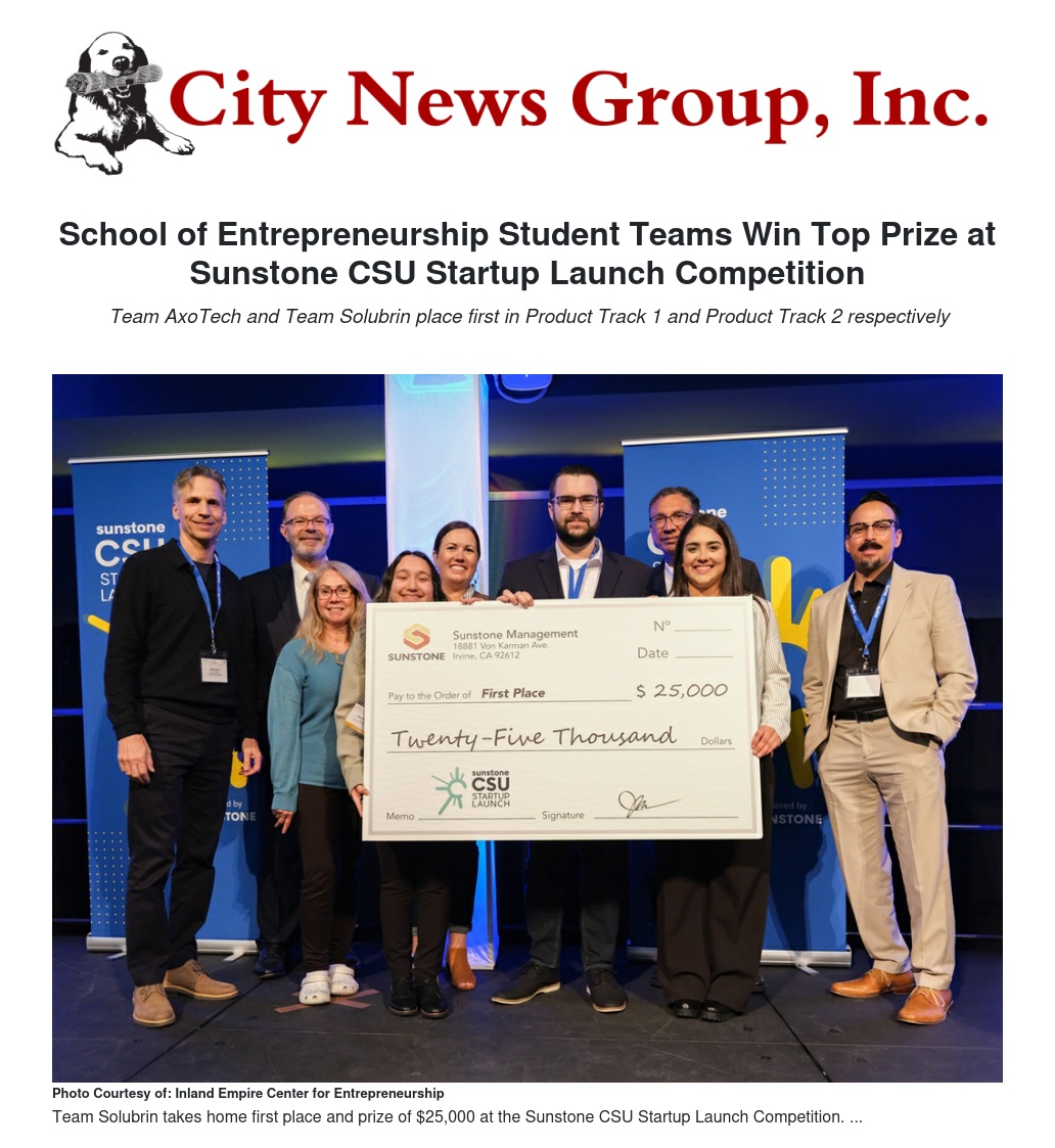 School of Entrepreneurship Student Teams Win Top Prize at Sunstone CSU Startup Launch Competition by California State University San Bernardino - City News Group, Inc.