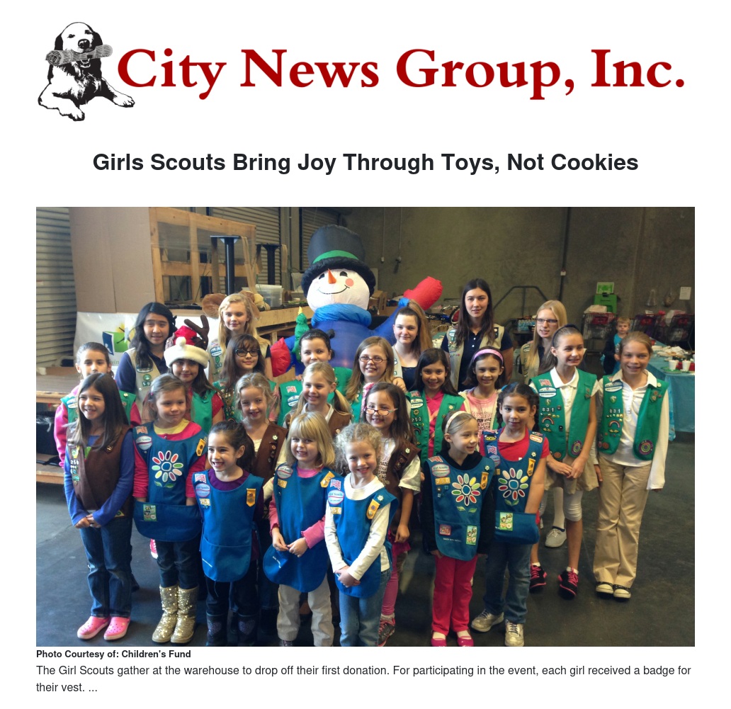 This year saw the first collaboration between the Girl Scouts of San Gorgonio Council and the Children's Fund's Annual Celebration of Giving campaign. The Girl Scouts went all around their communities to find new and unwrapped toys, then delivered them to warehouses used by Children's Fund for the event. The toys then found their way to underprivileged children throughout the area.