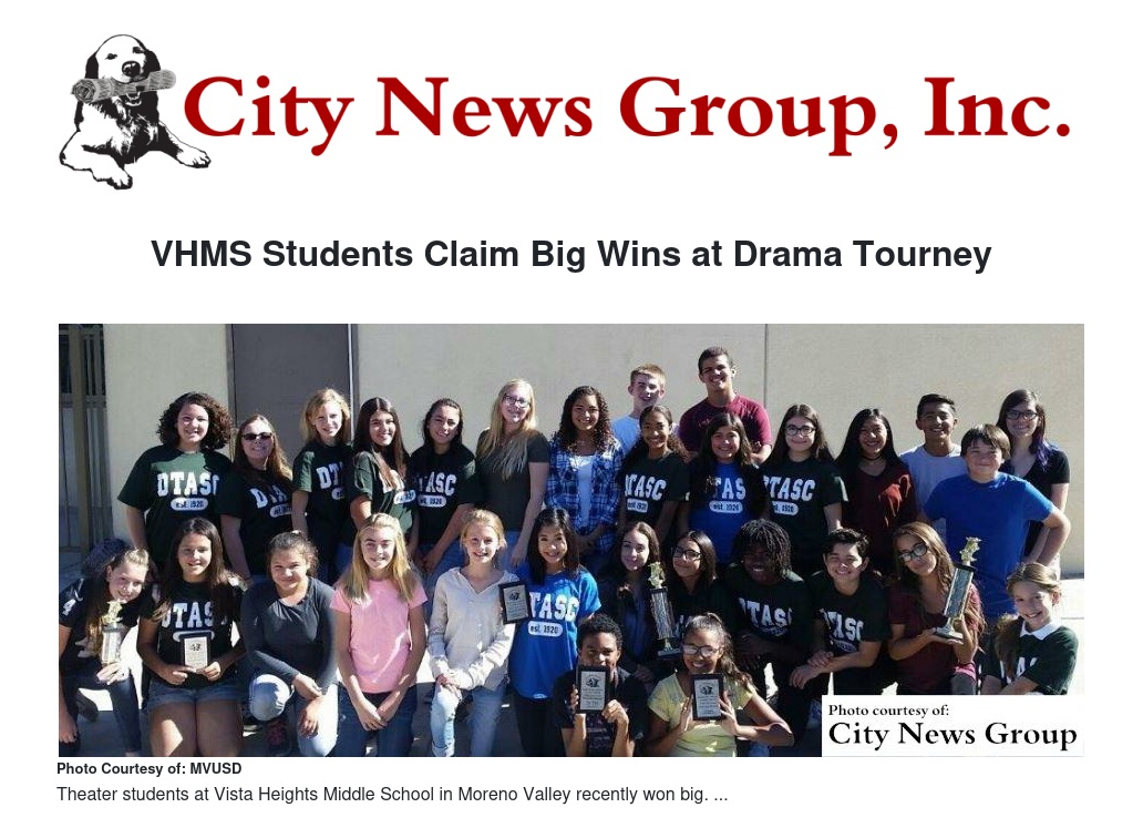 MORENO VALLEY>> Theater students at Vista Heights Middle School in Moreno Valley who came away from the recent Drama Teachers Association of Southern California Competition with two first-place wins.