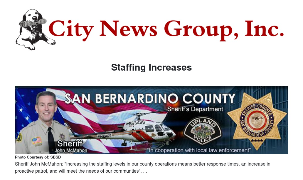 As a commitment to serve the residents of San Bernardino County, Sheriff John McMahon, in collaboration with the San Bernardino County Board of Supervisors, developed an action plan for the implementation of 15 additional deputy sheriff's to unincorporated county patrol stations over a six month period. In January 2014, Sheriff McMahon allocated a total of five deputy sheriff's to the Victor Valley and Morongo Basin Stations. An increase of six additional deputies will be added to the Fontana and Central Stations during the first weeks of April, 2014. The third deployment of additional resources will take place in June, 2014 and will be directed to the Victor Valley Station. "Increasing the staffing levels in our county operations means better response times, an increase in proactive patrol, and will meet the needs of our communties"said Sheriff John McMahon.