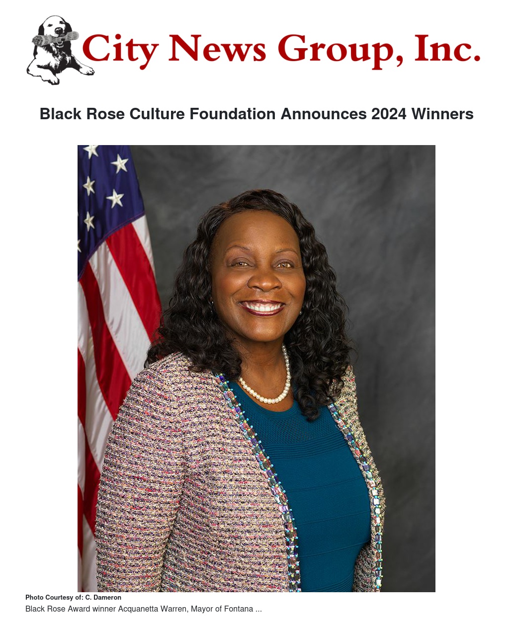 Black Rose Award winners include Acquanetta Warren, Mayor of Fontana, James C. Baker II, Park Commissioner for the City of Moreno Valley; Michael Beauregard, Assistant Manager at Sam’s Club; Tina Darling, Director of Education at American Career College, Ontario, and Chair of the Nursing and Health Ministry at New Hope Missionary Baptist Church; and Aristotle McDaniel, founder of GPL-Grandparents Love.”