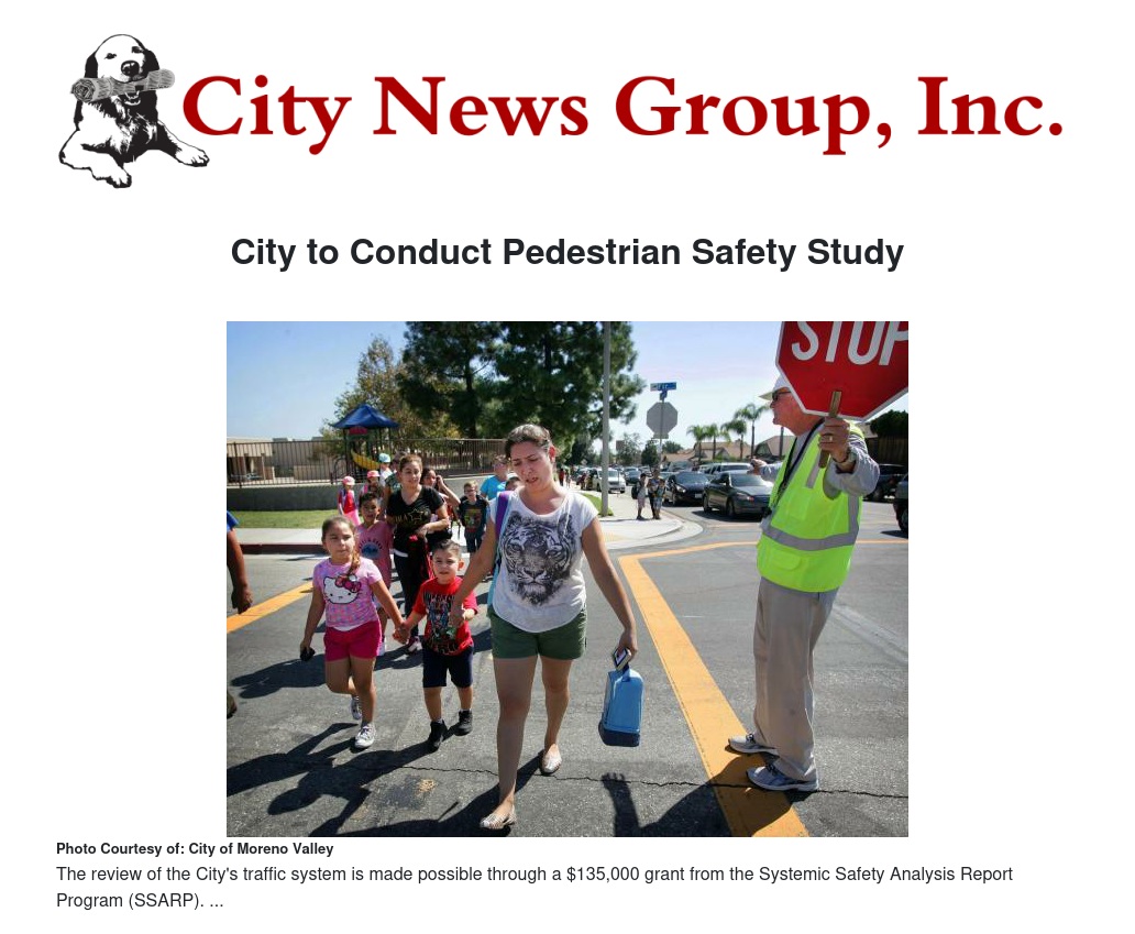 MORENO VALLEY>> The city's Public Works will be conducting a citywide pedestrian safety study as part of its continuing efforts to improve traffic safety and reduce collisions involving pedestrians.