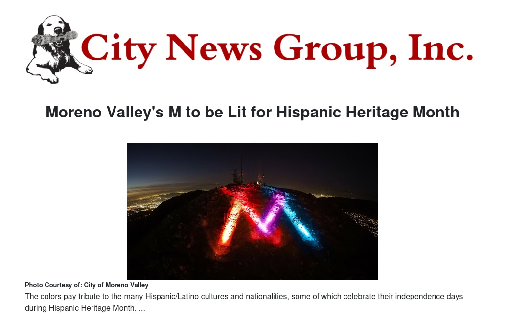 Moreno Valley's M to be Lit for Hispanic Heritage Month by City of Moreno Valley - City News Group, Inc.