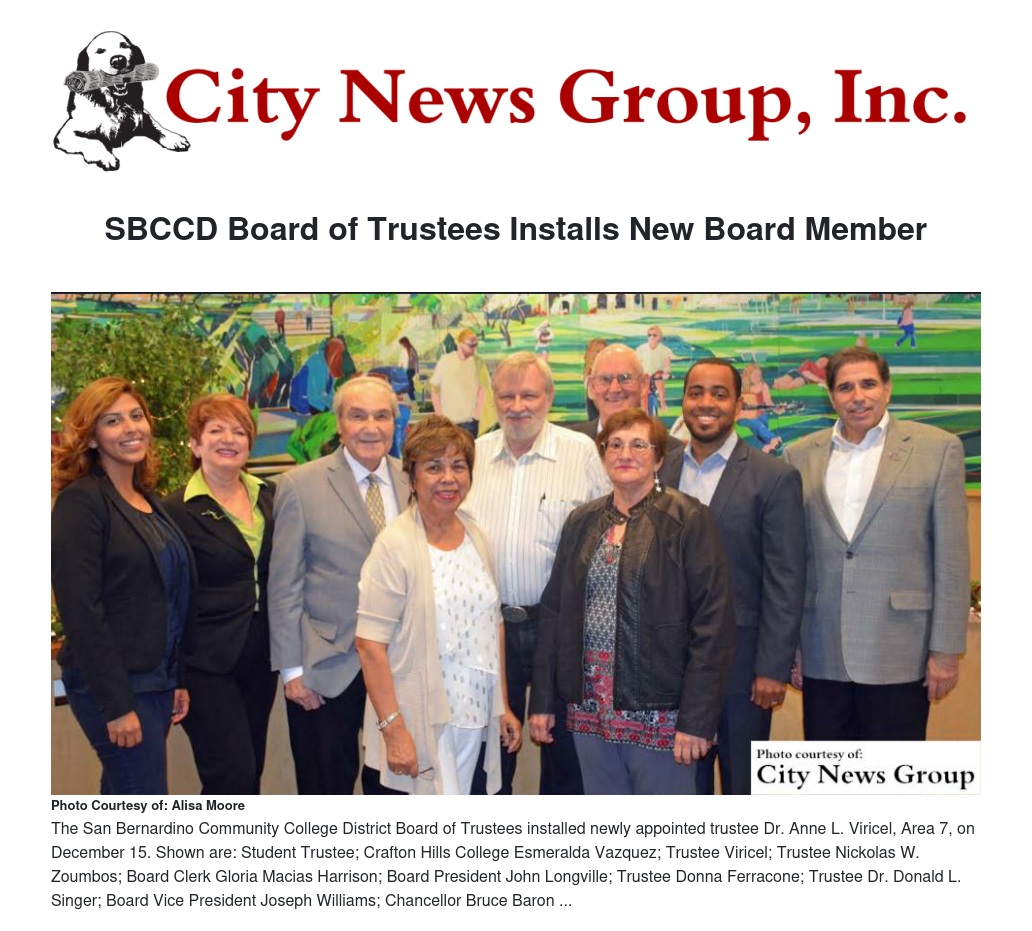 The San Bernardino Community College District (SBCCD) recently installed Dr. Anne L. Viricel of Highland to complete the term of Dr. Kathleen “Katy” Henry, who retired in October. Dr. Viricel was selected by the Board at their November meeting from four candidates.