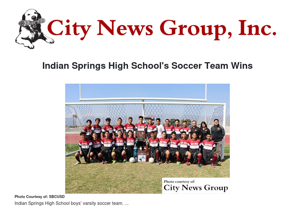 The Board of Education also honored the Indian Springs soccer champs at a reception at 5:30 p.m. on Tuesday, April 4 in the Community Room at the Board of Education building, 777 North F Street in San Bernardino.