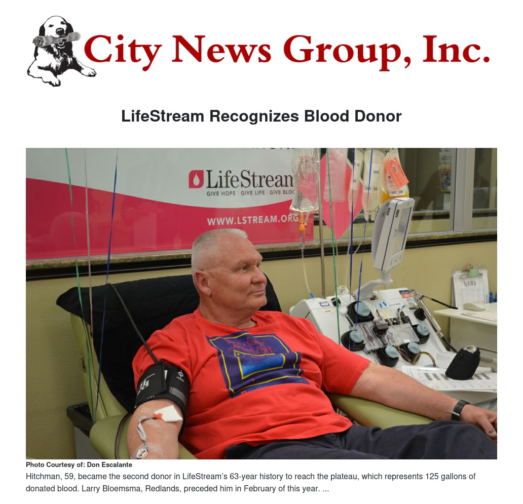 Hitchman, 59, became the second donor in LifeStream’s 63-year history to reach the plateau, which represents 125 gallons of donated blood. Larry Bloemsma, Redlands, preceded him in February of this year.
