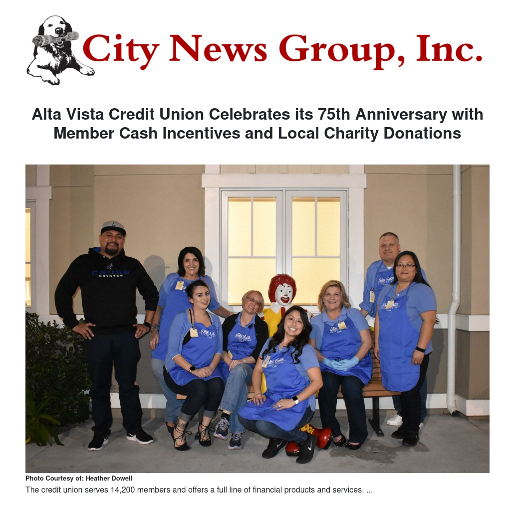 “Throughout our 75 years, community outreach and service has been an important part of our credit union,” said RaAnn Wood, President and Chief Executive Officer at Alta Vista Credit Union. “People helping people will remain the reason that Alta Vista Credit Union exists.”
