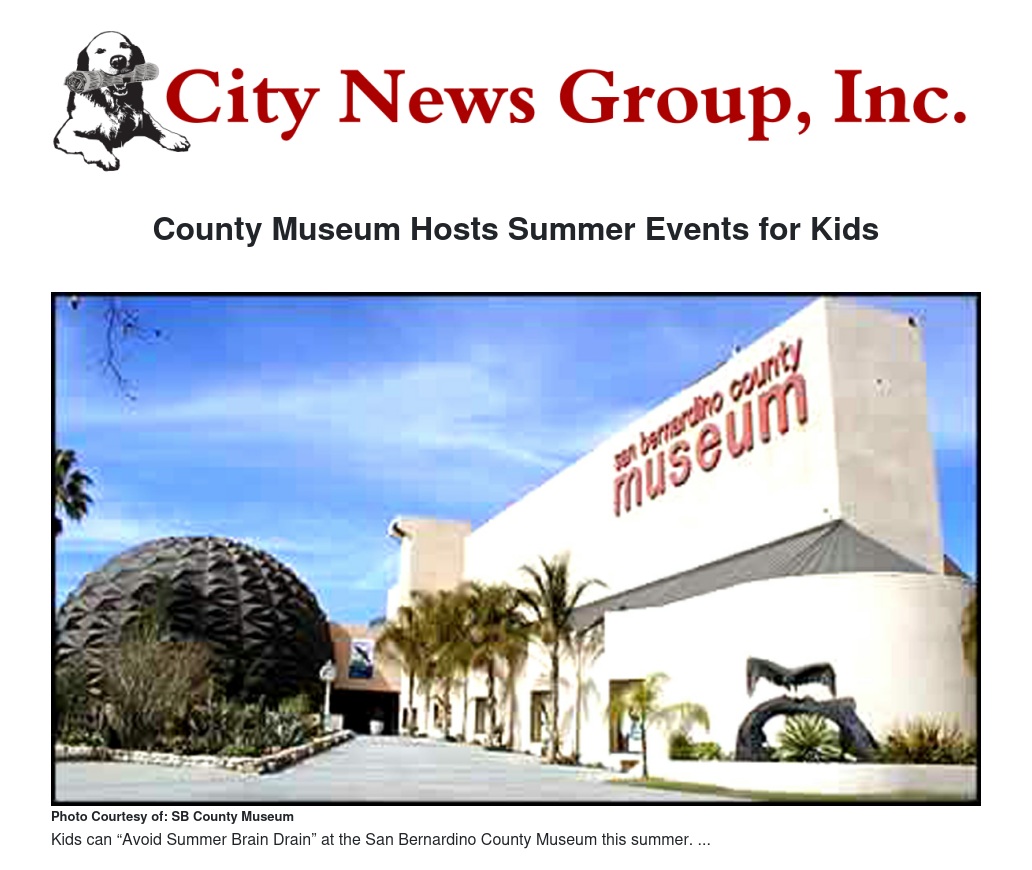 A series of informal programs at the San Bernardino County Museum will help kids “Avoid Summer Brain Drain” this summer. Activities are included with paid museum admission. No reservations are required, and the whole family is invited.