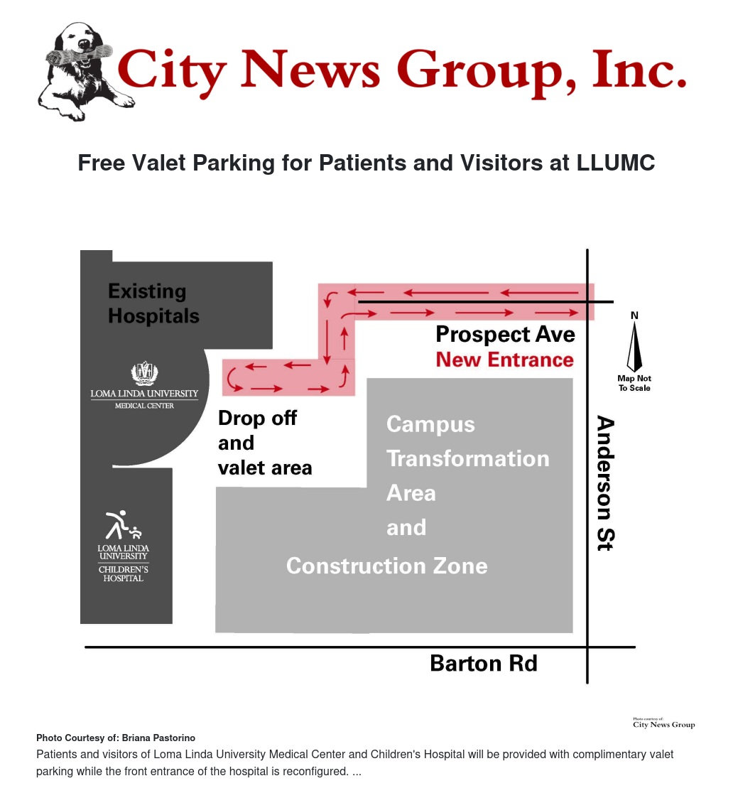 LOMA LINDA >> As of April 12, patients and visitors to Loma Linda University Medical Center (LLUMC) and Children’s Hospital are now being provided with complimentary valet parking due to the reconfiguration of the front entrance to the hospital.