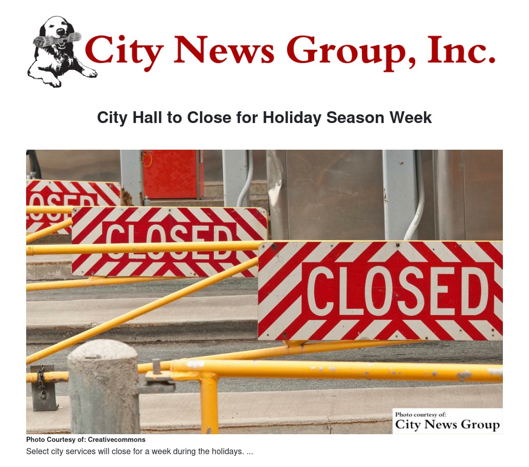 All city facilities and operations other than Police, Fire and emergency utility services will be closed Dec. 24 and 25 and Jan. 1.