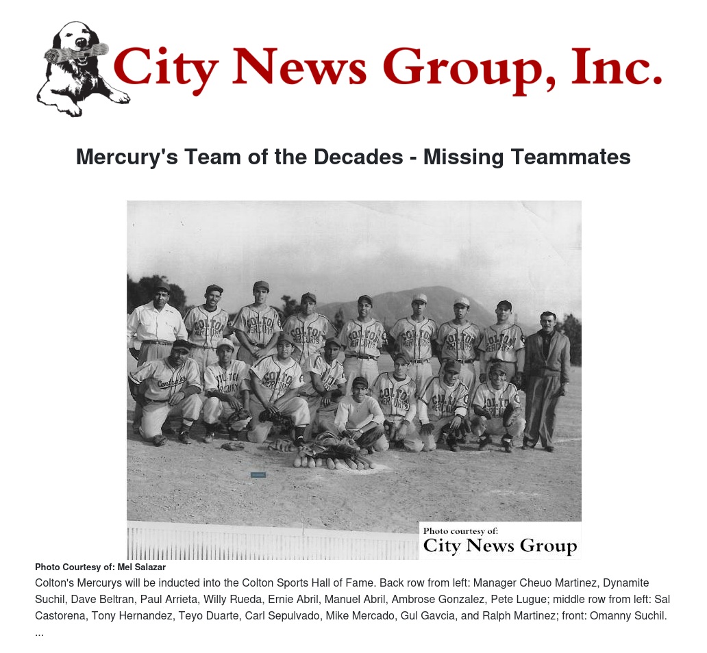 This coming April the Colton Mercury's Baseball Team will be honored and inducted into the Colton Sports Hall of Fame. The team will be called the Mercury's, Team of the Decade.