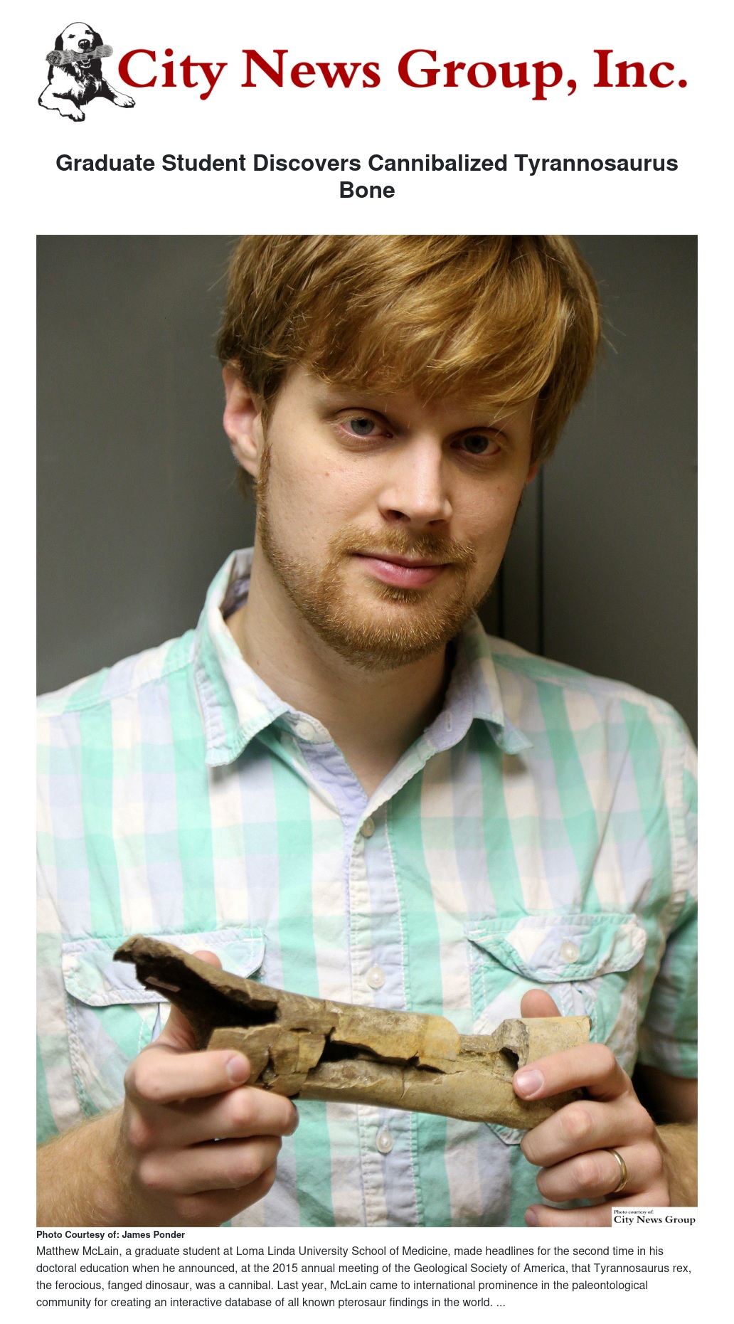 Matthew McLain presented his findings at the 2015 annual meeting of the Geological Society of America, which was held in Baltimore, Maryland, November 1-4. He also authored an abstract, which the society published under the title, “Tyrannosaur Cannibalism: a Case of a Tooth-Traced Tyrannosaur Bone in the Lance Formation of Eastern Wyoming.”