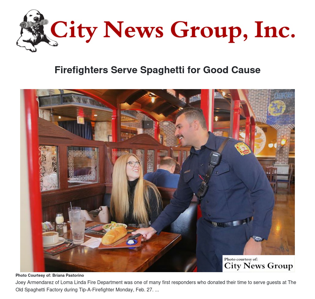 LOMA LINDA>> The Old Spaghetti Factory in Redlands was a hot spot Monday, Feb. 27 thanks to local firefighters. The 5th annual Tip-A-Firefighter took place during lunch and dinner at the Redlands restaurant, where funds were raised to help support the Loma Linda University Children's Hospital.