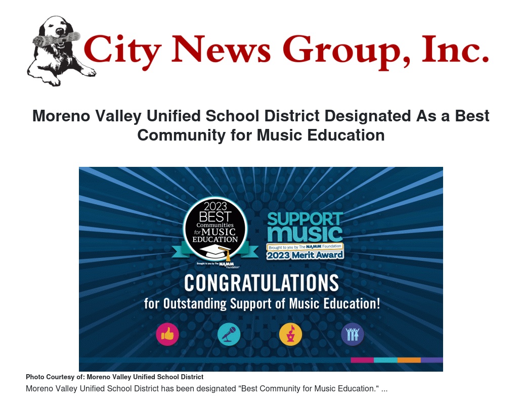In recognition of its outstanding commitment to music education, the Moreno Valley Unified School District has been designated a "Best Community for Music Education'' by the NAMM Foundation, one of 830 school districts in the nation.