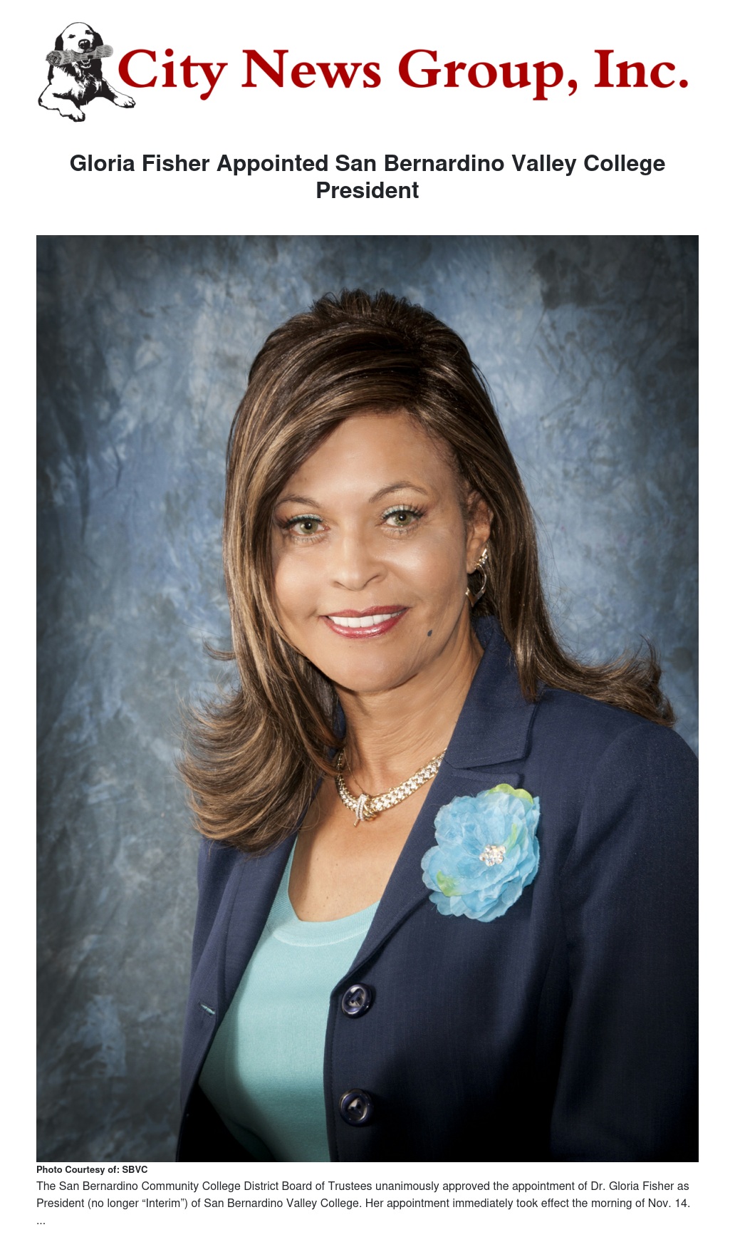 Last Thursday, Nov. 13, the San Bernardino Community College District Board of Trustees unanimously approved the appointment of Gloria Fisher, JD, as the 14th President of San Bernardino Valley College (SBVC).