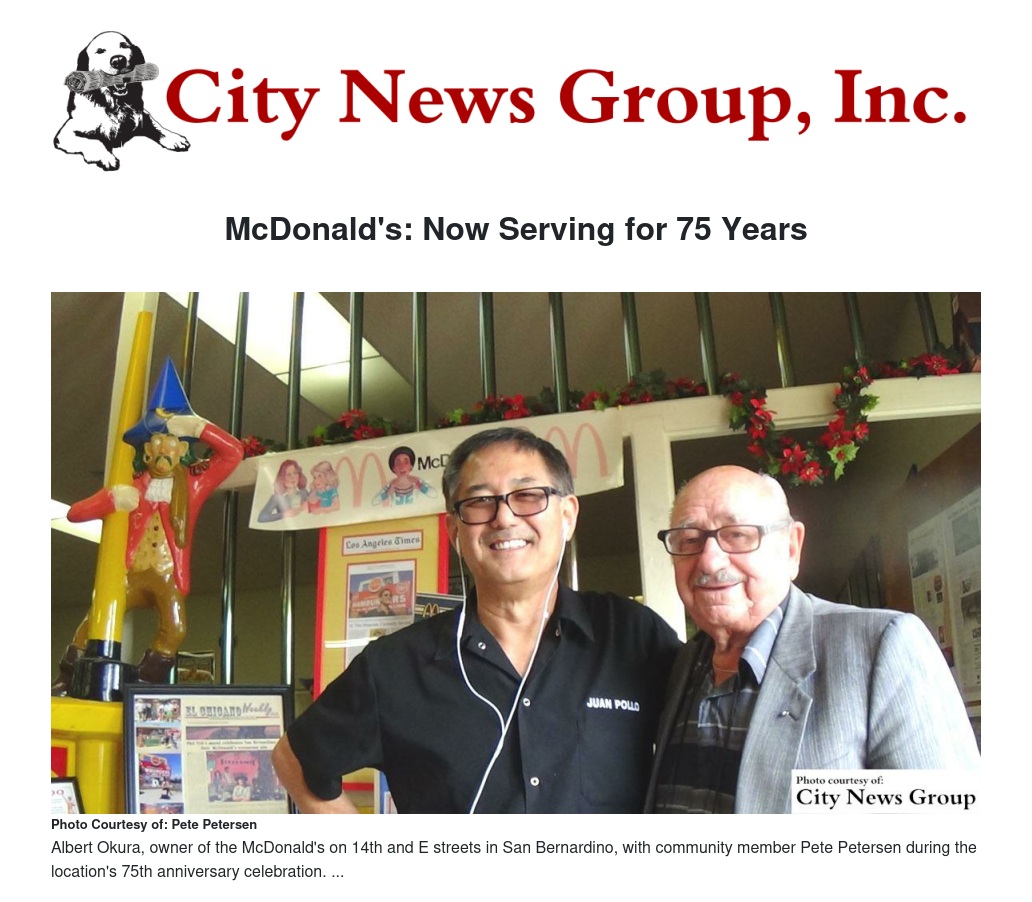 McDonald’s 75th anniversary was celebrated at an open house Saturday, May 15 at their original hamburger drive-in location at 14th and E streets in San Bernardino, near San Bernardino High School.