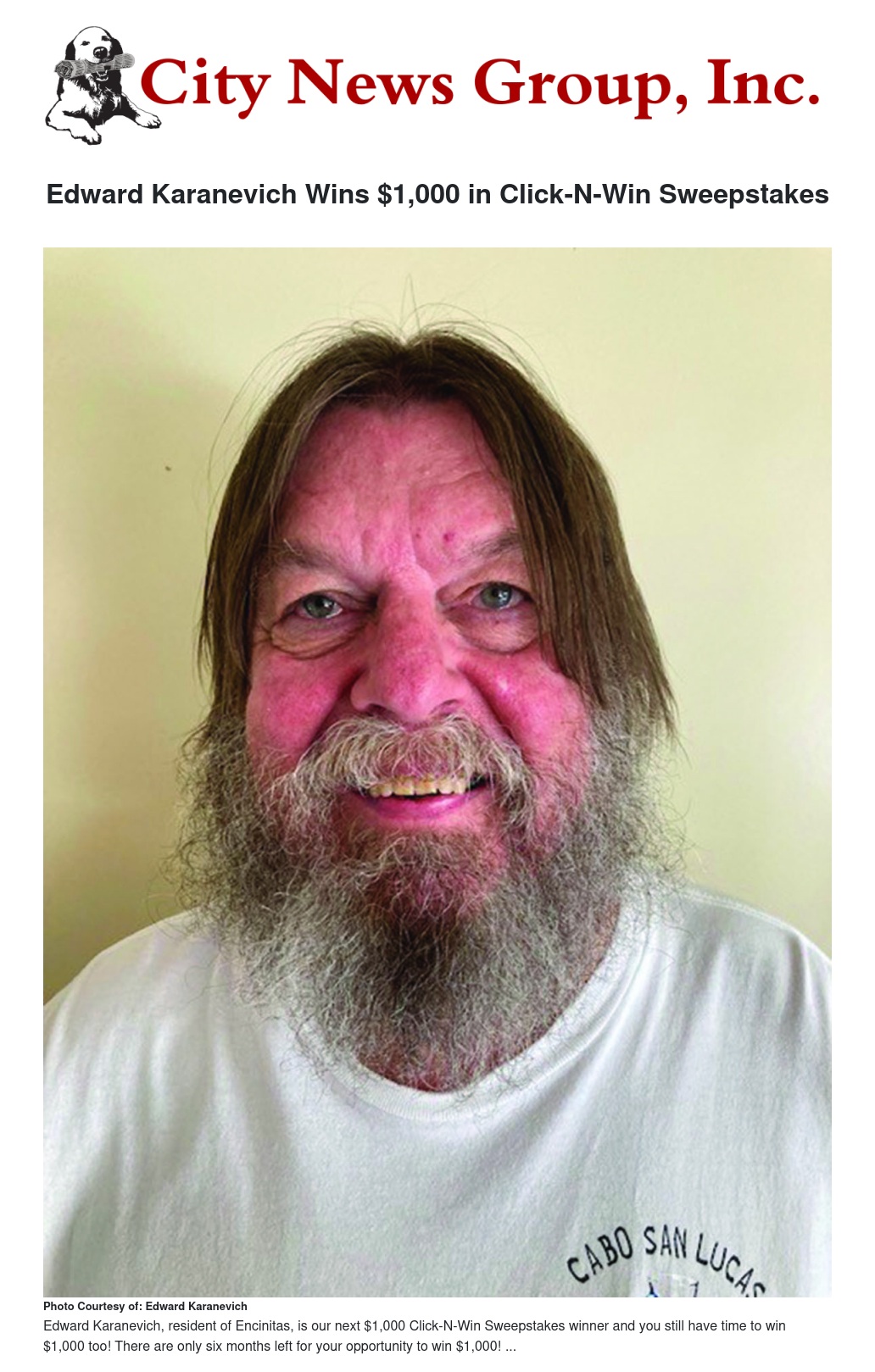 Edward Karanevich Wins $1,000 in Click-N-Win Sweepstakes by City News Group - City News Group, Inc.