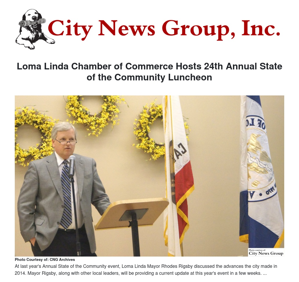 The Loma Linda Chamber of Commerce will host its 24th Annual State of the Community Luncheon on Friday, Dec. 11, from 11:30 to 1:30 p.m. at the Loma Linda Senior Center located 25571 Barton Road, Loma Linda, with check-in starting at 11:15 a.m.