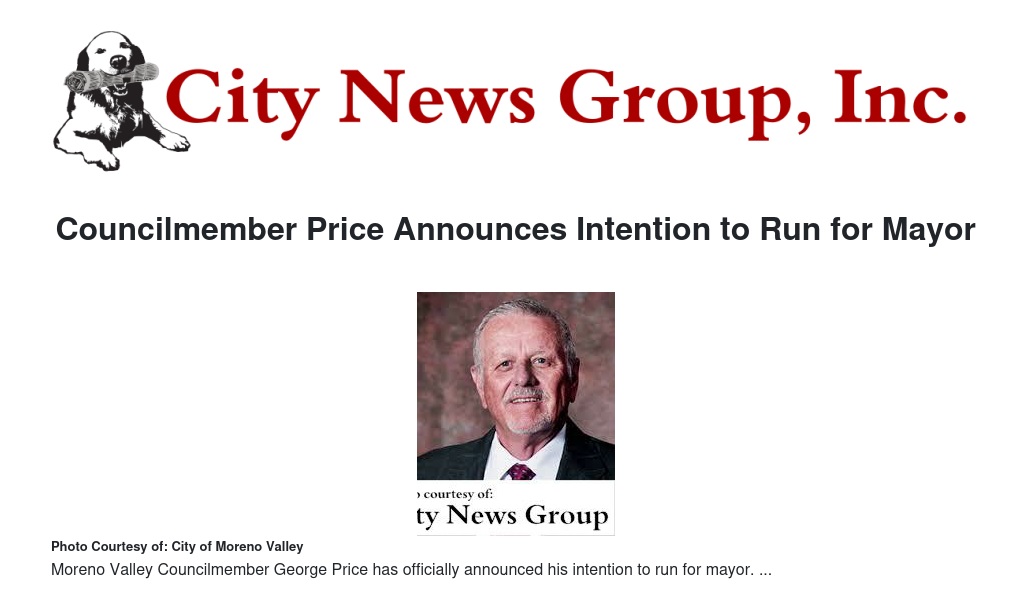 MORENO VALLEY >> George Price, Moreno Valley Councilmember and longtime resident, has officially announced his intention to run for Mayor of Moreno Valley.