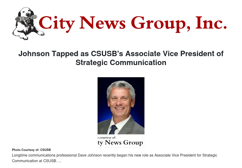 Longtime communications professional Dave Johnson has been named associate vice president for strategic communication at Cal State San Bernardino, as announced earlier today by the university. He began his duties May 11 and is charged with realigning the Office of Public Affairs, Creative Services and Photography/Videography into a unified Office of Strategic Communication. In addition to administrative duties, Johnson will serve as chief media contact for CSUSB.