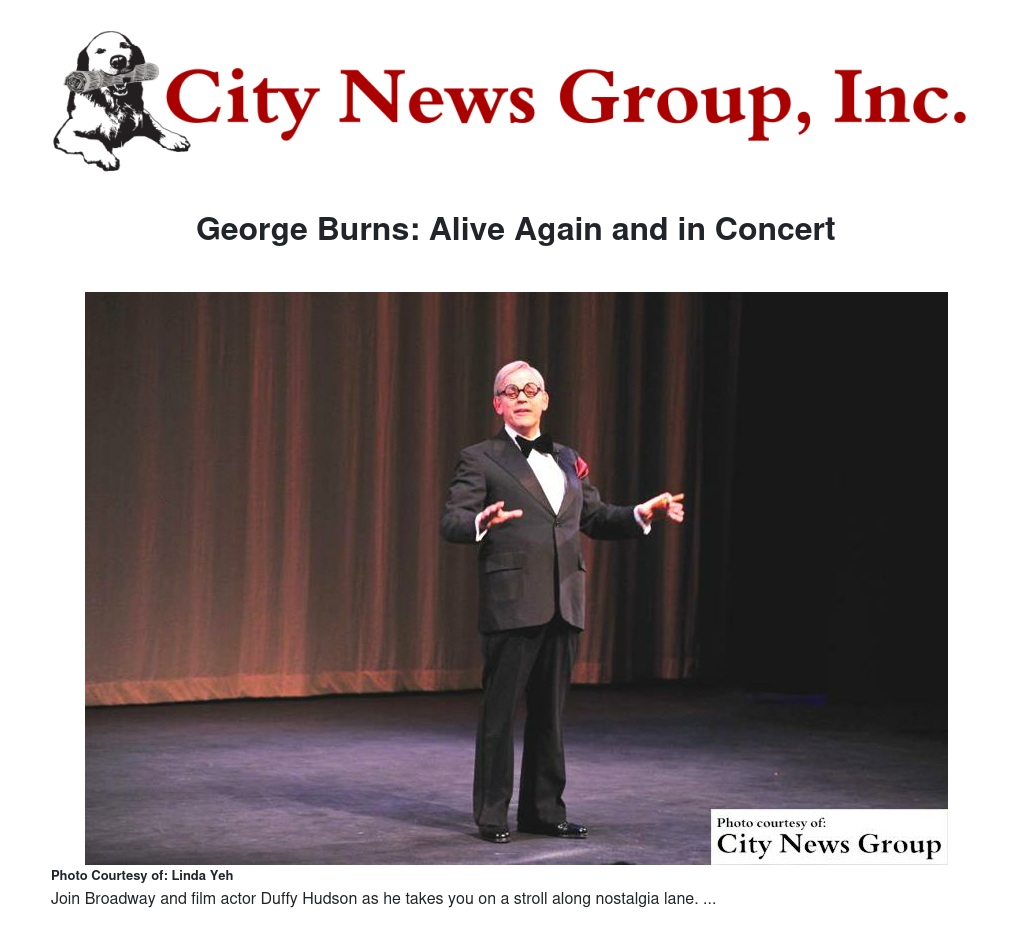The cigar, the glasses, the wit and the kind Grandfather like image he projected in his later years all found a way into our hearts and many of us grew up with George as another member of the family. Join Broadway and film actor Duffy Hudson as he takes you on a stroll along nostalgia lane. “George Burns” sings, dances and tells stories like only George Burns can.