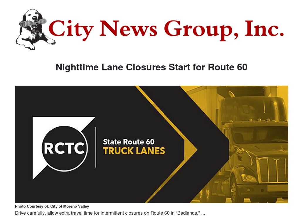 Nighttime Lane Closures Start for Route 60 by City of Moreno Valley - City News Group, Inc.