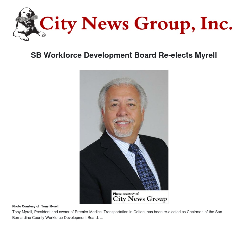 Myrell, President and owner of Premier Medical Transportation in Colton, has served on the WDB for more than six years. He holds one of just 25 spots on the Board of Directors for the National Association of Workforce Boards which selects chairs from the top-performing regions around the country to work closely with legislators to influence national policy and support partnerships in education, business, economic development and labor.