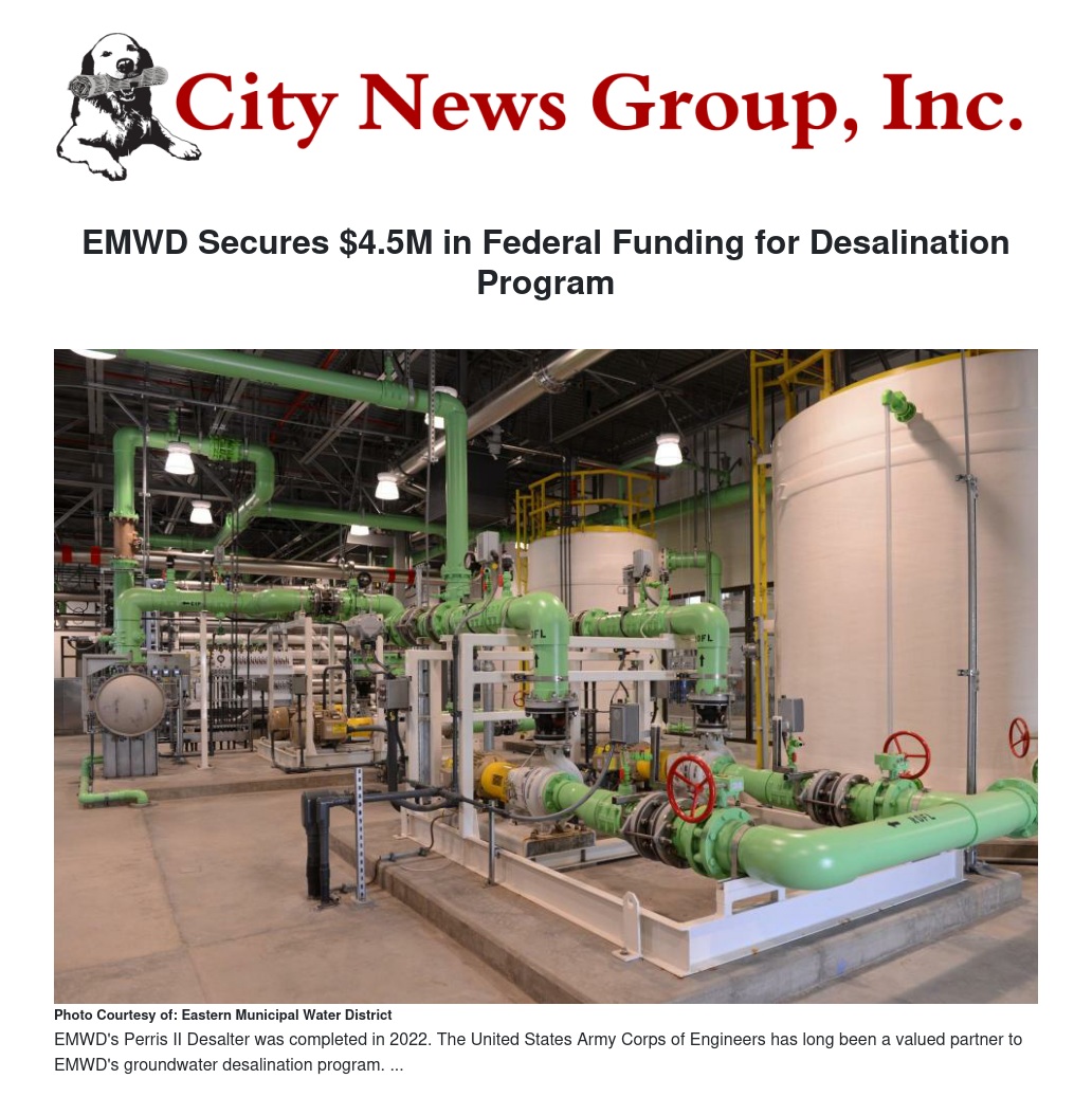 “EMWD appreciates the continued support and partnership with the Army Corps of Engineers, which has been a longstanding and valued partner in the success of our desalination program,” EMWD Board President Phil Paule said. “We also wish to thank our Congressional Delegation, whose emphatic support was incredibly valuable in helping to advance this funding request.”