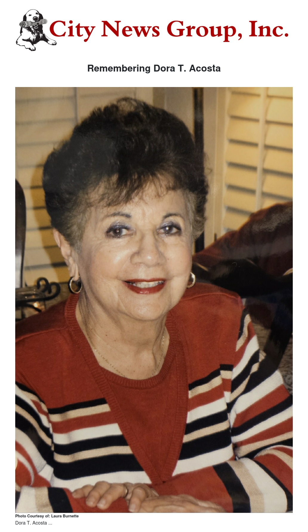 Life long Colton resident, Dora Acosta passed away on April 14, 2024. She was preceded in death by her husband of 60 years John Acosta . Dora is survived by sons John and Mark Acosta, daughters Diana (Ernie) Santana, Laura (Clark) Burnett, grandchildren Moses & Kristen Felix, Adrienne & Alec Acosta, Johnny & Daniel Acosta, and great grandchildren Alexa & Jonah Ayala. Dora retired from the Colton School District after 32 years and was a member of the San Salvador Church Bereavement Ministries for 24 years. Funeral Services will be held on Tuesday, May 14, 2024, at 11:00 AM at San Salvador Church, 169 West L Street, Colton, CA. Burial will be held at 1 PM at Hermosa Cemetery, 900 N. Meridian Avenue, Colton.