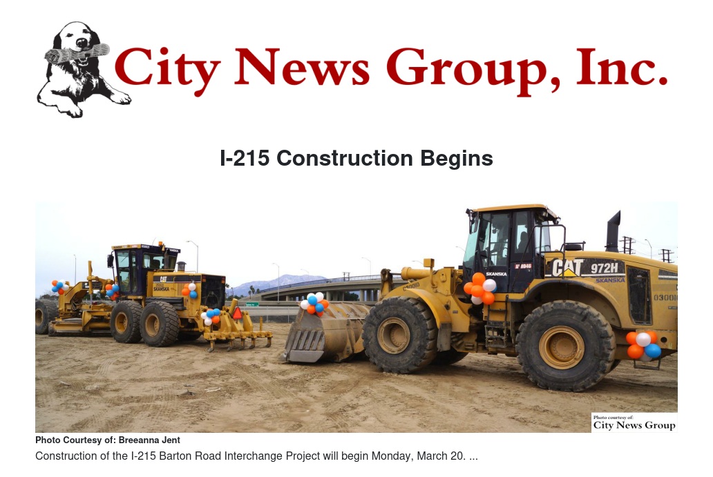 GRAND TERRACE>> Starting on the week of March 20, construction began on the I-215 Barton Road Interchange Project. Construction crews began utility relocation, which is much needed as part of the planned improvements to the Barton Road Interchange.