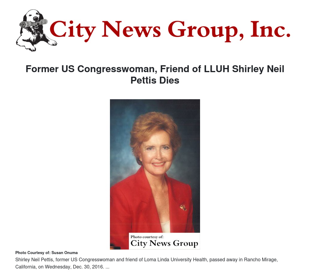 LOMA LINDA>> Shirley Neil Pettis, former US Congresswoman and friend of Loma Linda University Health, passed away in Rancho Mirage, California, on Wednesday, Dec. 30, 2016 at the age of 92.
