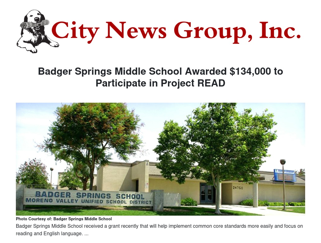 Badger Springs Middle School in the Moreno Valley Unified School District (MVUSD), was recently selected by the California Department of Education as one of only 44 schools in the state to receive the Project READ grant totaling $134,000.