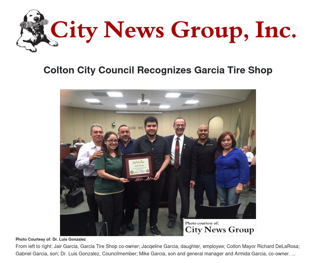 COLTON>> At the recent Colton City Council meeting, Councilmember Dr. Luis S. Gonzalez presented Garcia Tire Shop with a “business focus” recognition award for 26 years of business in the City of Colton.
