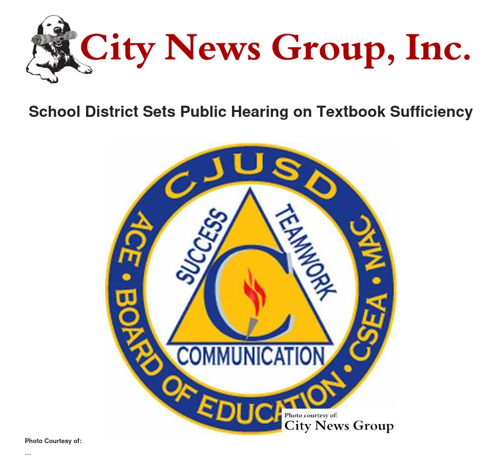 The Colton Joint Unified School District will conduct a public hearing on Thursday, Aug. 20 to certify that the District is in compliance with the State of California Education Code for ensuring that each pupil from transitional kindergarten through 12th grade has sufficient textbooks and instructional materials that are consistent with the content and cycles of curriculum frameworks adopted by the State Board of Education.