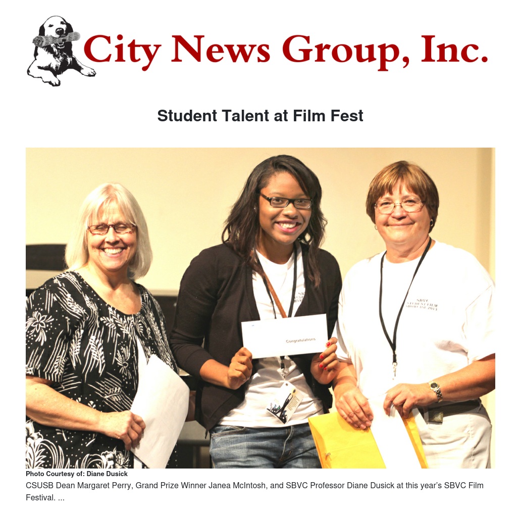 Winners of the 2013 SBVC film festival included Jerit Smith (SBVC) in Best Audio, Best Special Effects and Best Producer–Community College; Mistre Murillo (SBVC) in Best Lighting; Stephen Cardenas (Redlands High School) in Best Original Screenplay; Blake Dirksen (Redland High School) in Originality/Creativity and Best Producer–High School; Romulo Mena (CSUSB) in best Editing–Film and Best Cinematography–University; Tanya Velazquez (University of La Verne) in Best Editing–News or PSA; Carlos Flores (Cal State University Fullerton) in Best Producer–University; Alan Sanchez (SBVC) in Festival Producer’s Choice; Jesse Haendinges (Redlands High School) in Best Cinematography–High School; and Janca McIntosh (SBVC) in Best Cinematography–Community College.
