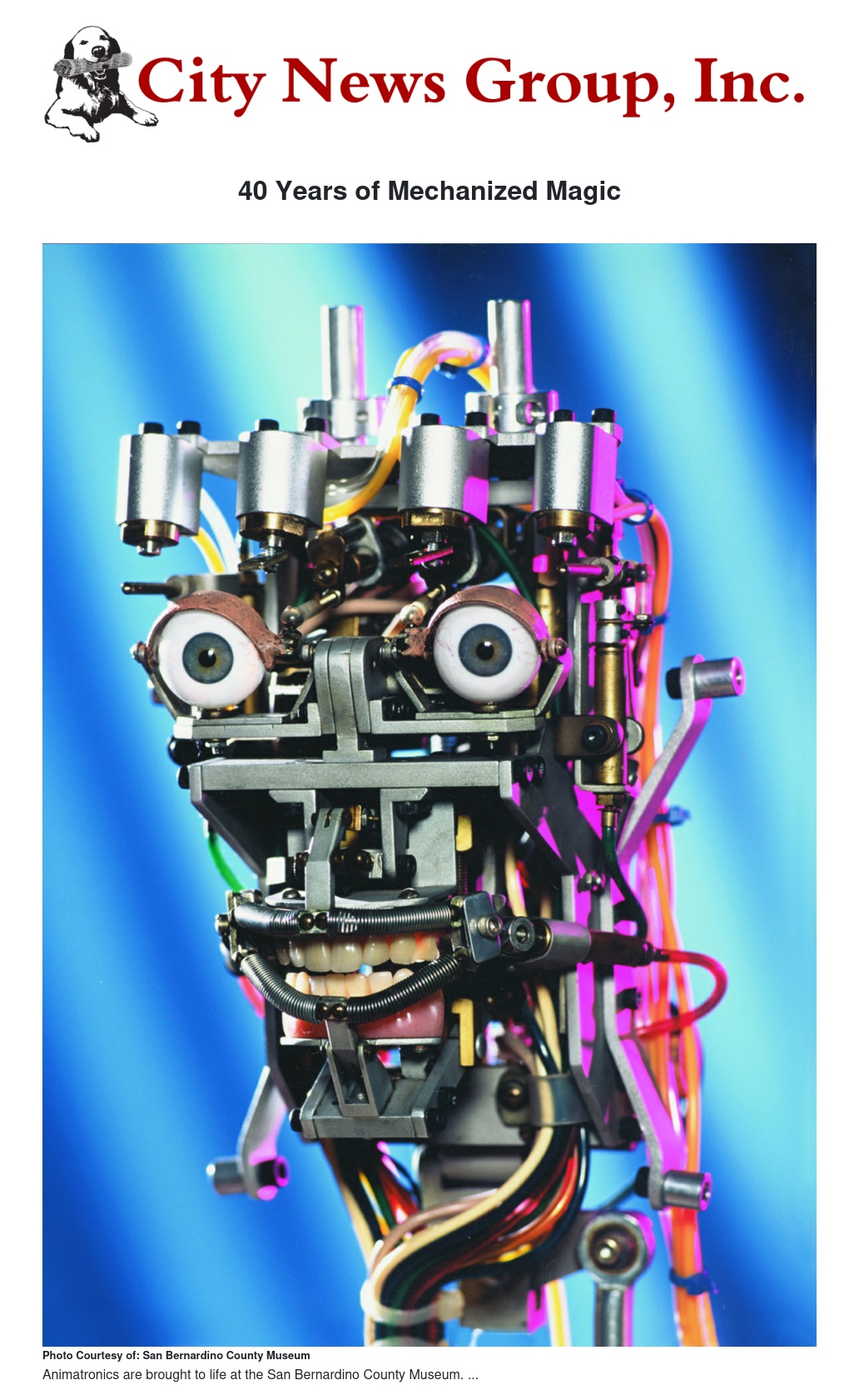 The San Bernardino County Museum is at 2024 Orange Tree Lane, at the California Street exit from Interstate 10 in Redlands. The museum is open Tuesdays through Sundays from 9 a.m. to 5 p.m. General admission is $10 (adult), $8 (military or senior), $7 (student), and $5 (child aged 5 to 12). Children under five and Museum Association members are admitted free. Parking is free. “Mechanized Magic: 40 Years of Garner Holt Productions in San Bernardino County” is included with museum general admission.