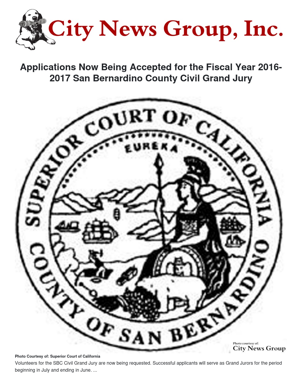 Volunteers for the 2016-2017 San Bernardino County Civil Grand Jury are now being requested, announced Raymond L. Haight, III, Presiding Judge of the Superior Court. The recruiting period is open for those citizens interested in serving. Successful applicants will serve as Grand Jurors for the period beginning July 1, 2016 and ending June 30, 2017.