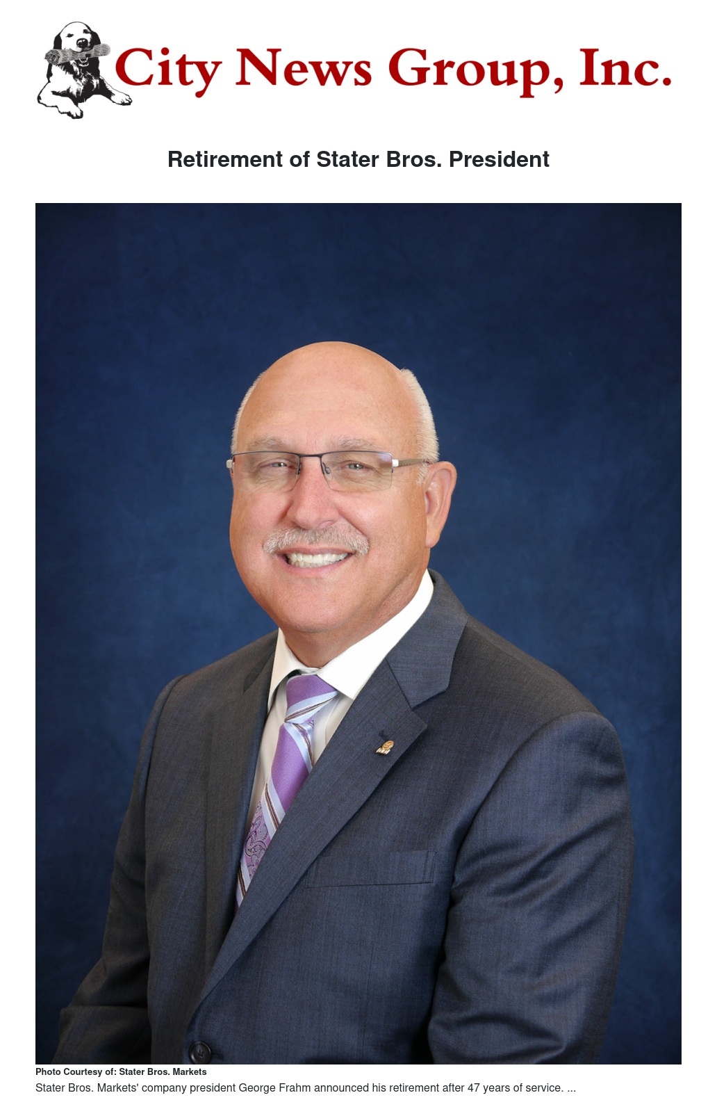 After more than 47 years of service to Stater Bros. Markets, the Company’s President and longtime food industry leader, George Frahm (66) has announced his plans to retire on Oct. 31, 2019.