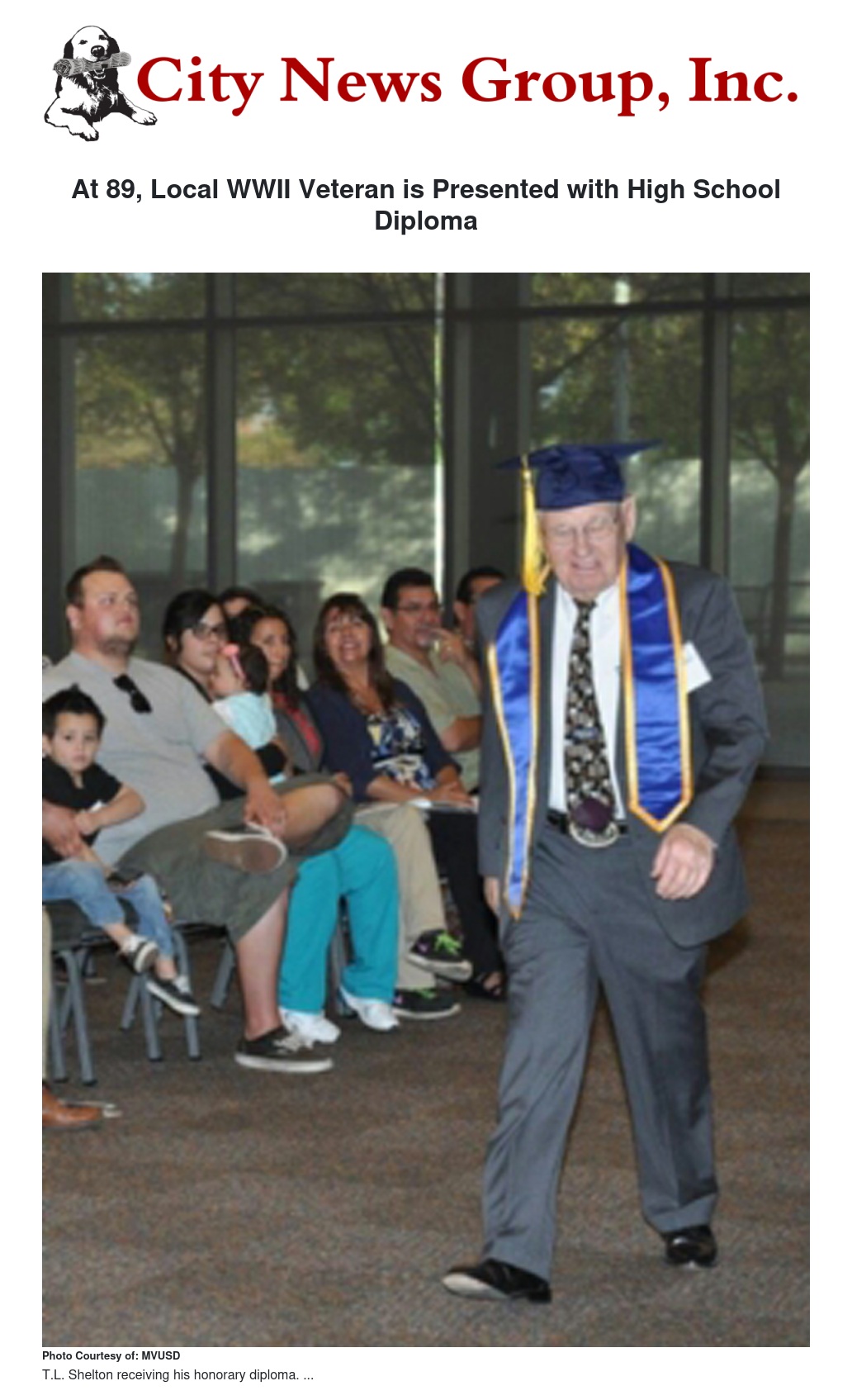 T.L. Shelton was awarded the Purple Heart and the Bronze Star for his Army service in World War II. But it wasn’t until Nov. 12 of this year that the 89-year-old veteran finally claimed a high school diploma. Shelton, whose grandson and granddaughter are teachers at MVUSD, was presented with an honorary diploma by the Riverside County Office of Education in ceremonies at Moreno Valley.