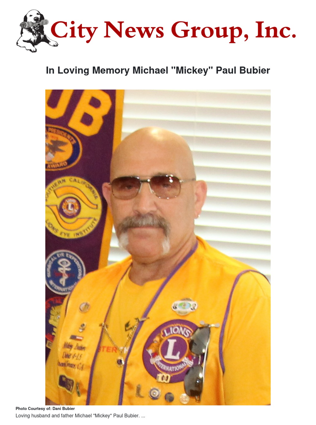 Mickey was preceded in death by his parents. He leaves behind his wife Danelle "Dani" Bubier of Grand Terrace, his daughter Niki Page of Oceanside, grandsons Austin and Clint Page of Grand Terrace, brother and sister-in-law Scott and Vicky Bubier of San Bernardino, and nephew Scotty Bubier are of Tennessee.