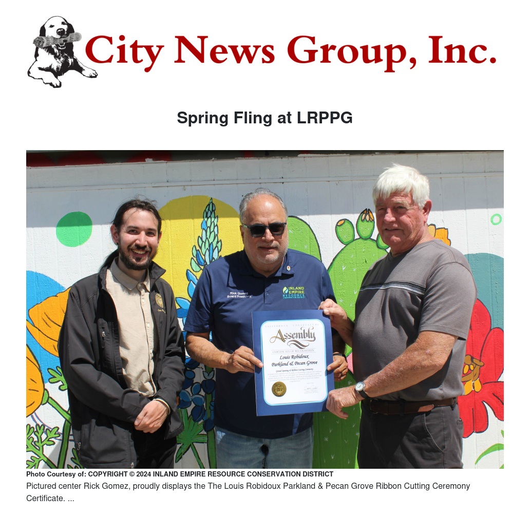 The Louis Robidoux Parkland & Pecan Grove (LRPPG) is a 40-acre property located along the Santa Ana River in Jurupa Valley. The site is owned by Riverside County Regional Parks and Open Space District, and under the management of five local agencies including non-profits Huerta del Valle and Sunshine Haven Wildlife Rehab, and government agencies Inland Empire Resource Conservation District, Orange County Water District, and the San Bernardino Valley Municipal Water District. To learn more, please visit louisrobidouxparkland.org.