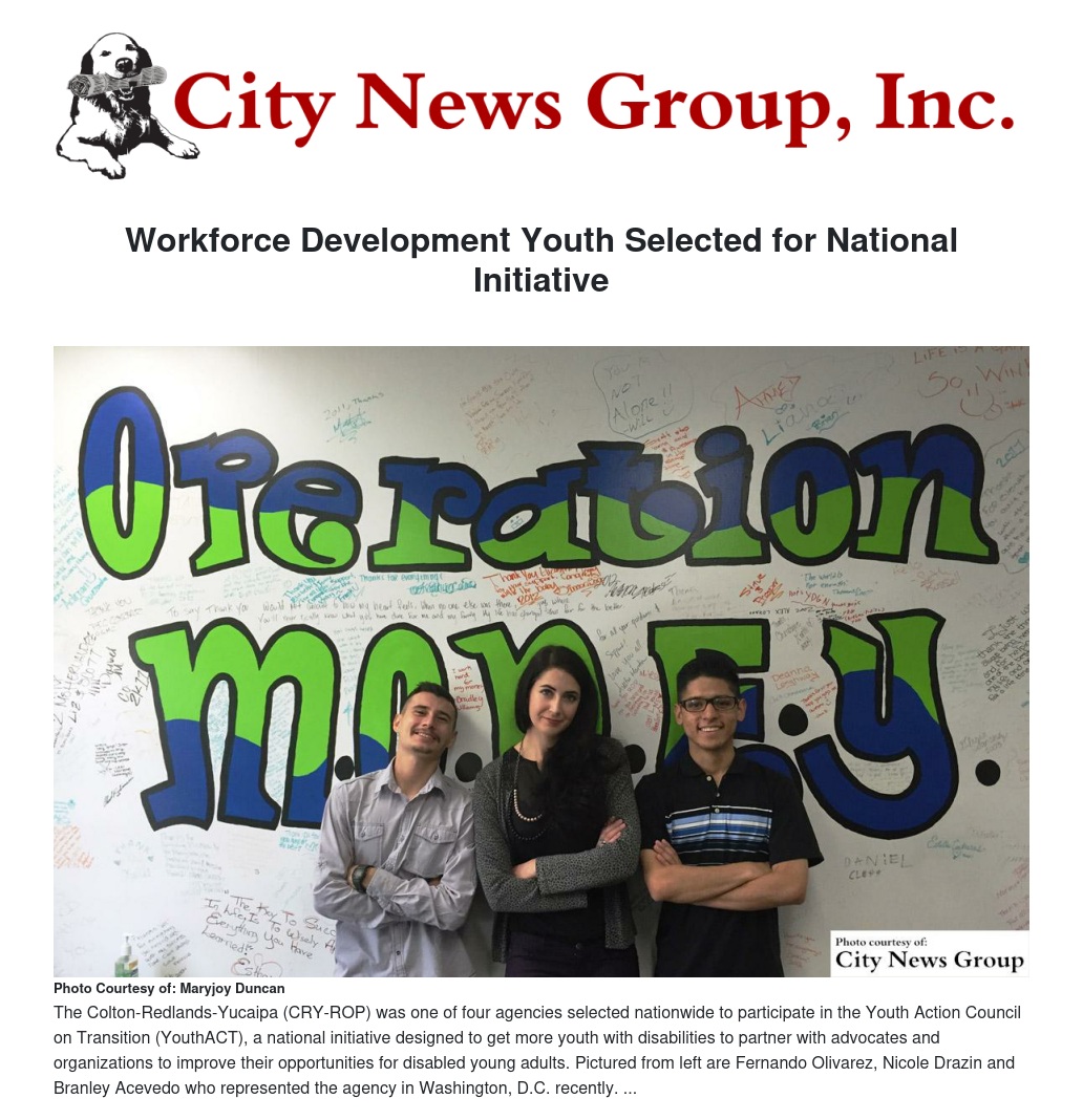 The Colton-Redlands-Yucaipa Regional Occupational Program (CRY-ROP) was one of four agencies nationwide selected by the National Collaborative on Workforce and Disability for Youth to participate in the Youth Action Council on Transition (YouthACT).