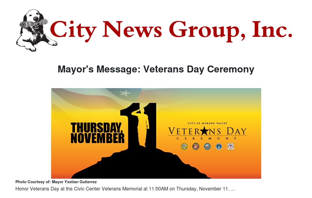 Every year, on the 11th hour of the 11th day of the 11th month, we gather to honor our nation’s heroes who bravely stepped up to defend our values. This Veterans Day, we will be honoring those courageous souls with a ceremony befitting of a military town like Moreno Valley.